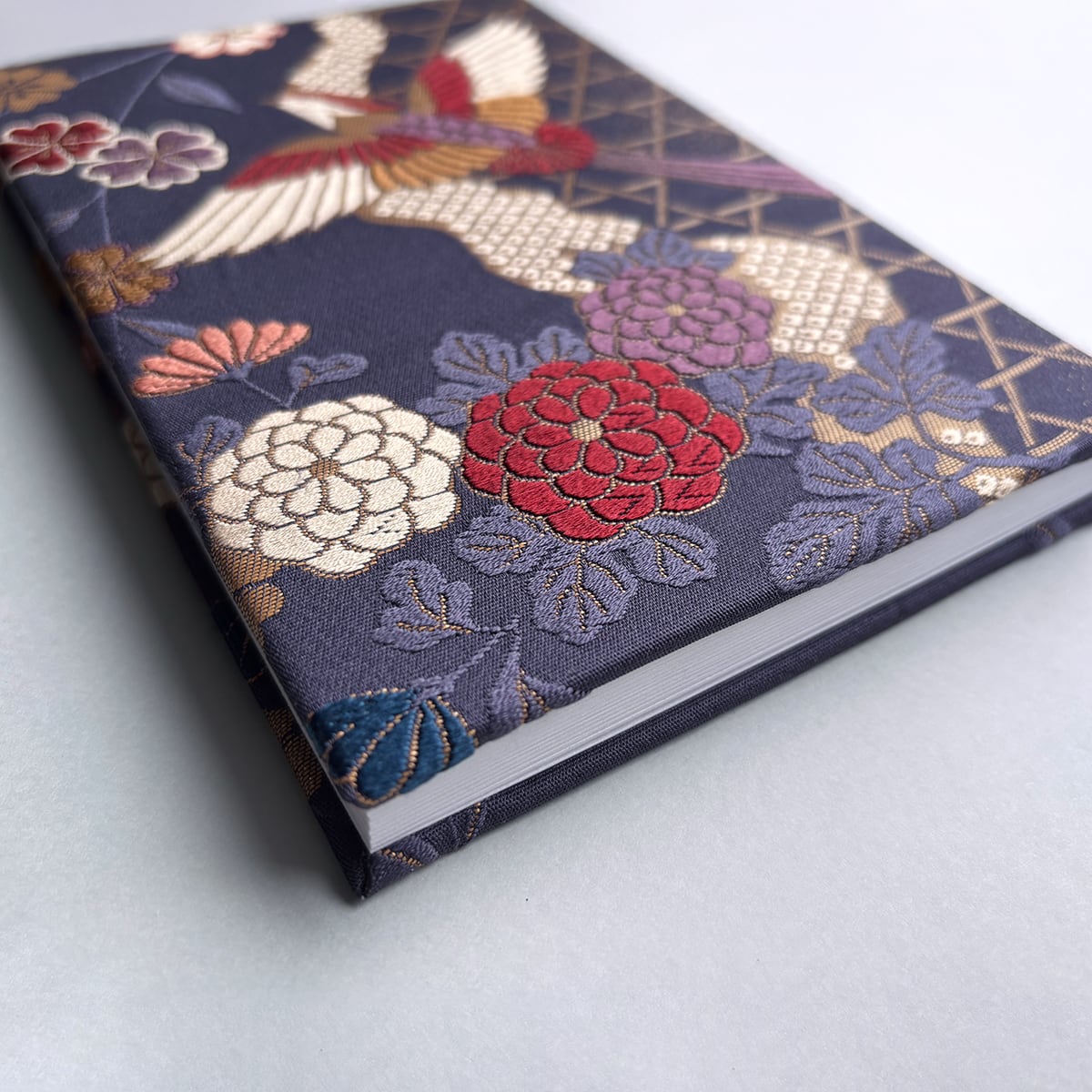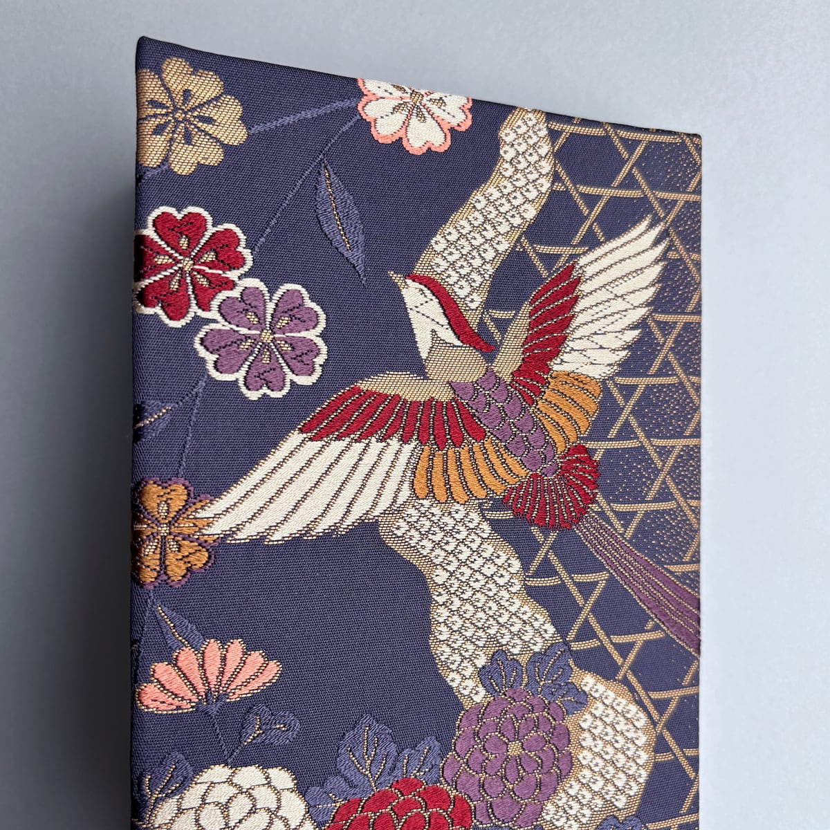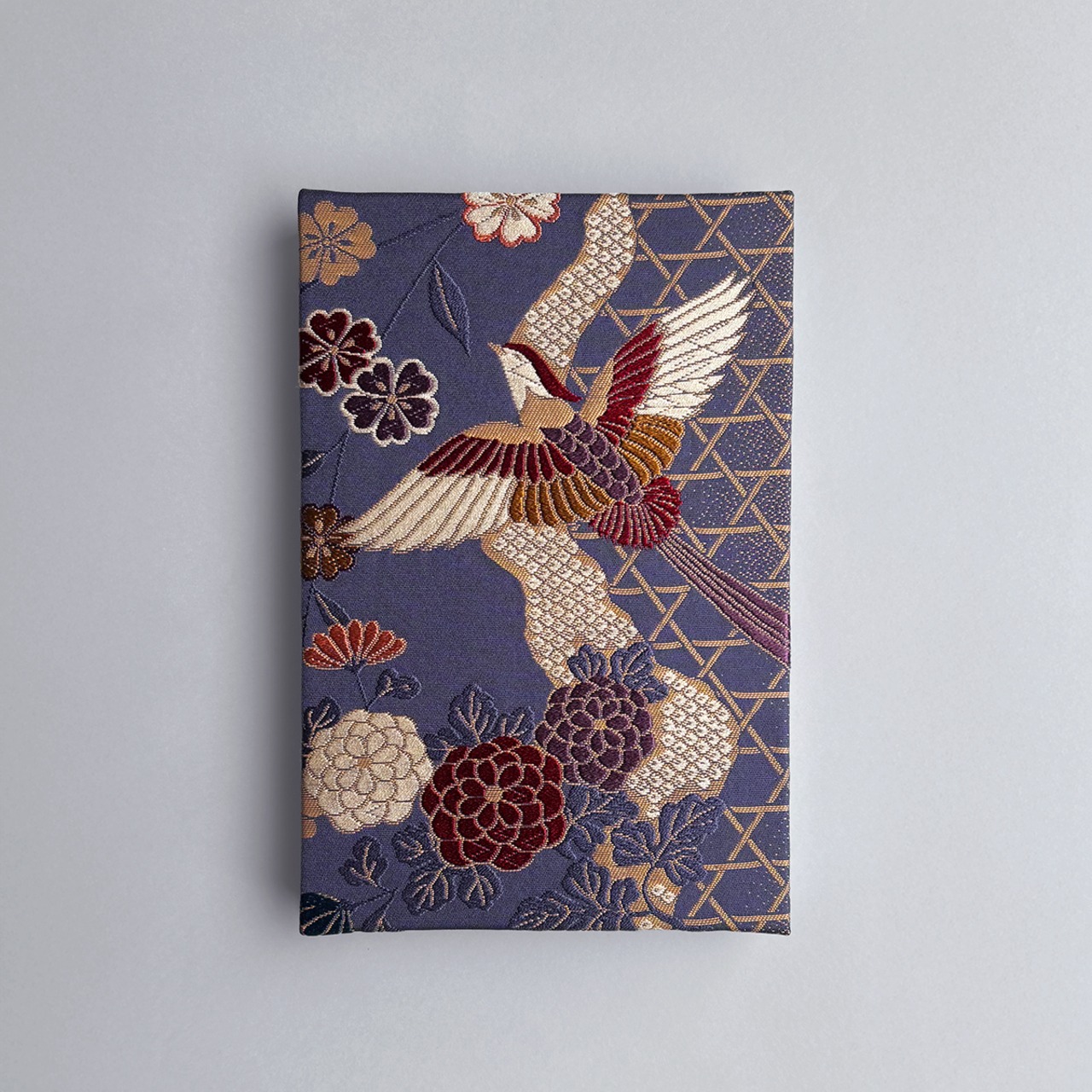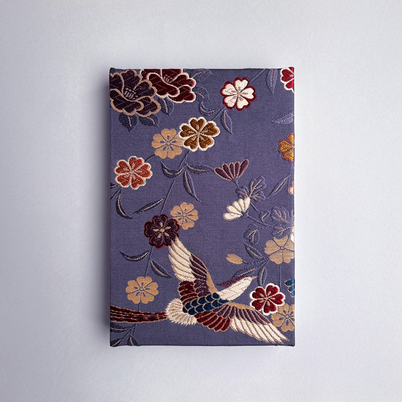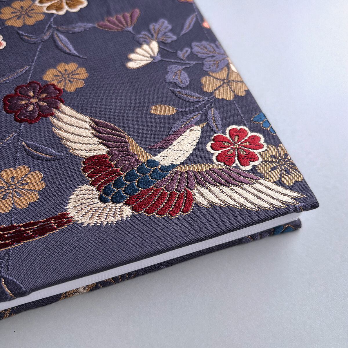 深みのある青紫色の生地に自由に舞う尾長鳥。