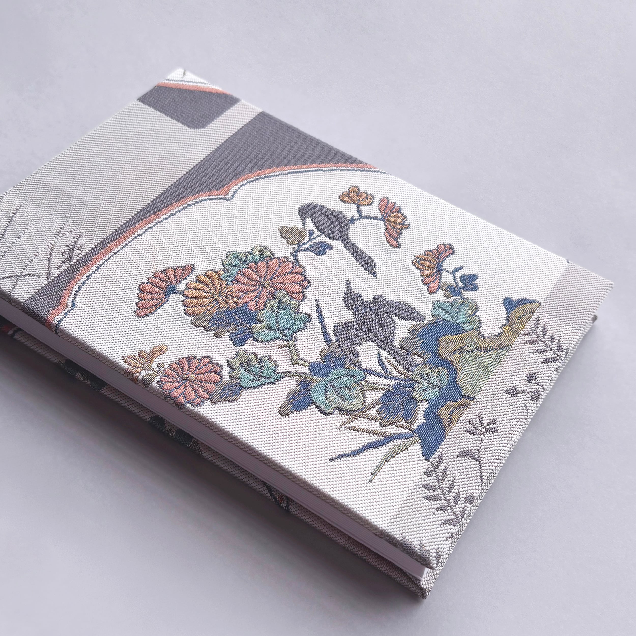 御朱印帳 和柄 アンティーク帯使用 大判|シルバー 神社仏閣 菊 雀 鳥文様 No.405