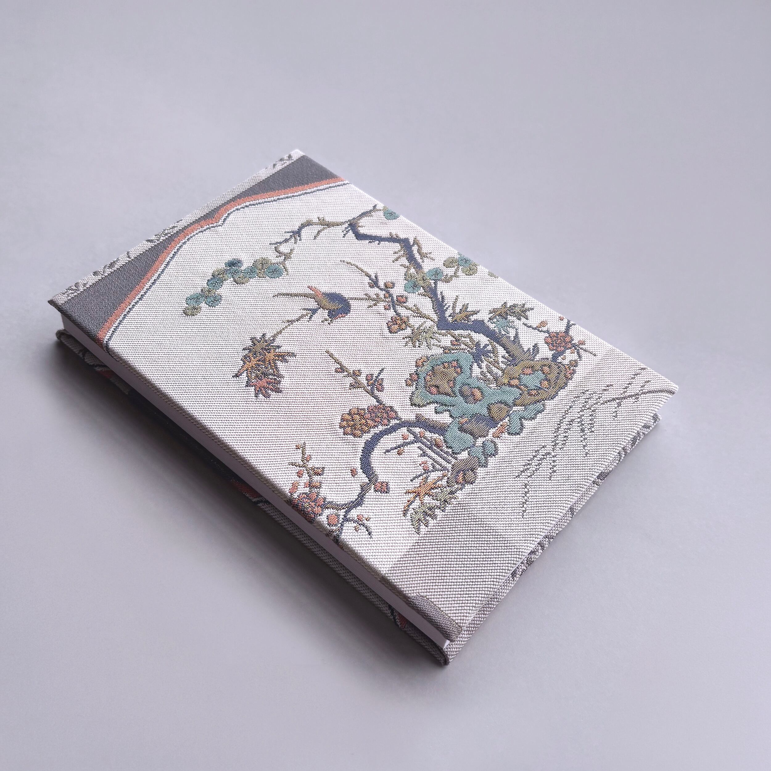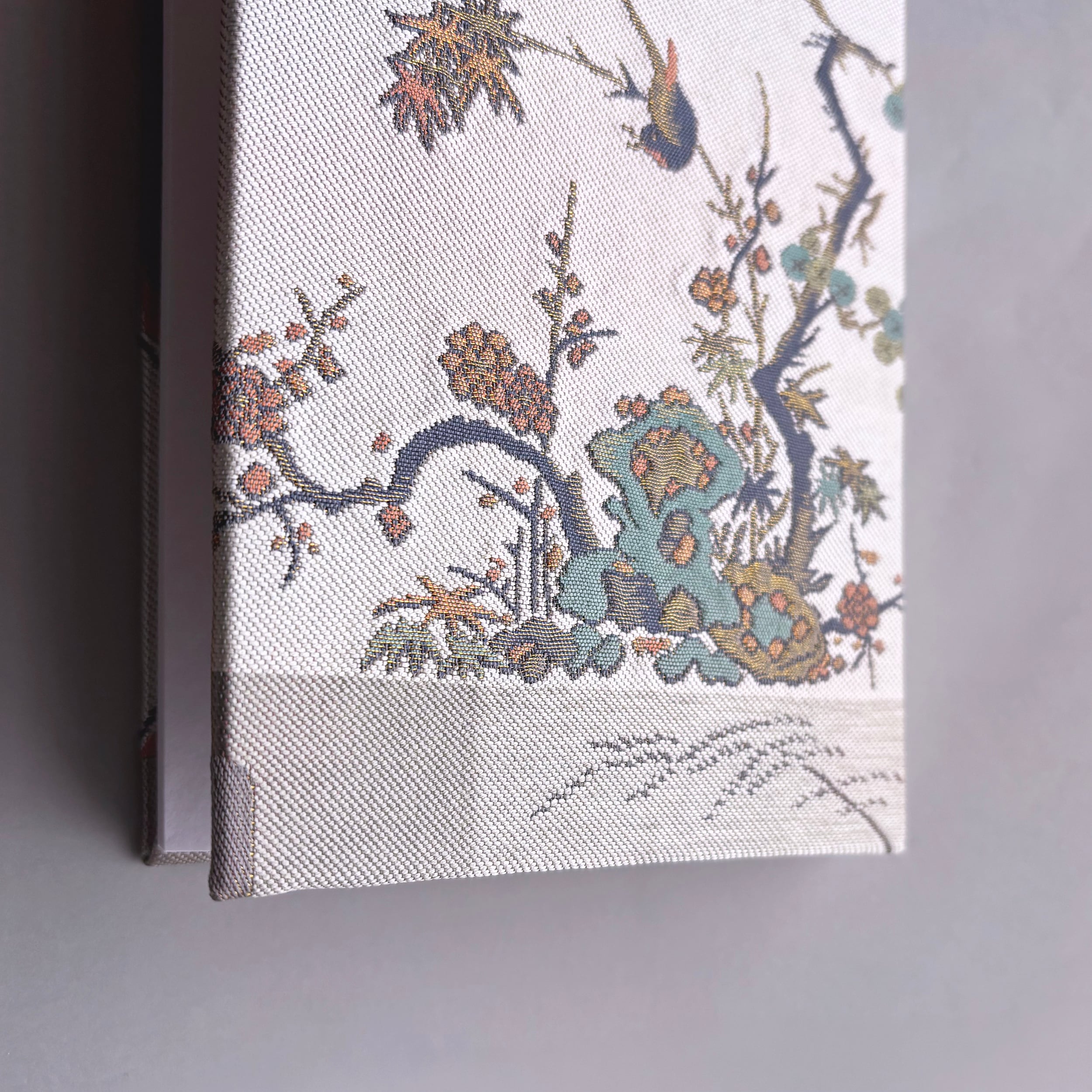 繊細に織り上げられた生地に、可憐に咲く花々と小鳥の姿が描かれた御朱印帳。